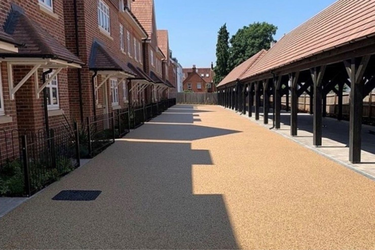As a decorative finish, and one that is more expensive, it’s not as common to see Resin Bound surfacing being used in more commercial areas. However, you will find it installed in areas that require a decorative finish but must also receive heavier traffic. In this instance you may be laying it on 2 layers of tarmac binder course and much more substantial sub base. For heavier trafficked areas that receive, for example, light delivery vehicles or areas that need to withstand emergency vehicle access we would lay up to 24mm depth.