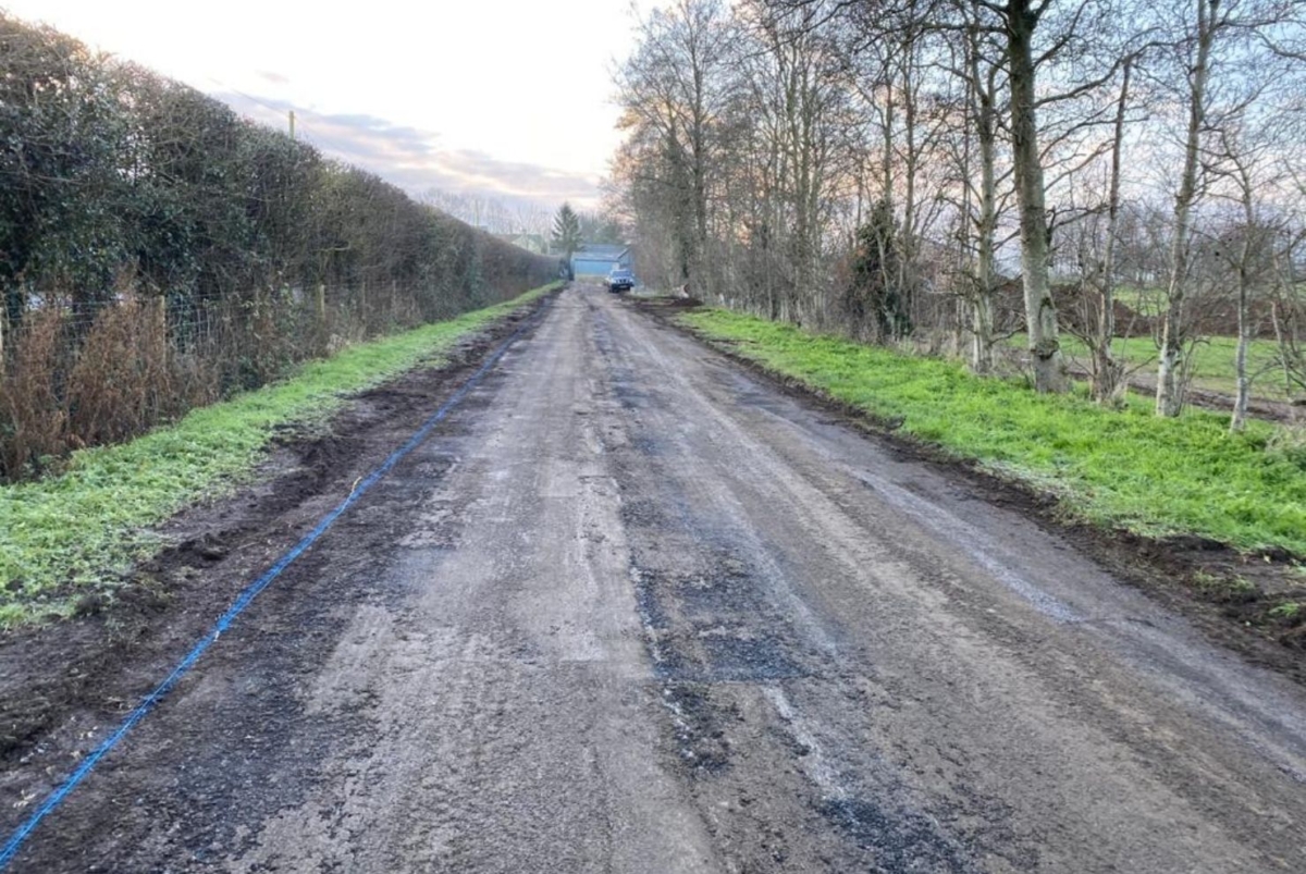 When creating a new parking area like this the fine detail in the planning is vitally important. At this early stage the correct setting out of kerbs, sub base and drainage helps the project run smoothly. Using experience ground workers, we excavated the area to the required depths, applied a geotextile membrane to reinforce and stabilise the structural layers, and laid a layer of crushed rock hard-core. Then came another layer of MOT Type 1 crushed rock sub base and finally the installation of kerbs to the perimeter of the new area. Accuracy of the sub bases at this stage ensures the surfacing works can be carried out to specification. Along with the new parking area, we scraped off the existing entrance track ready for new surface course overlay. See our blog on Access Tracks for details and options for surfacing these.