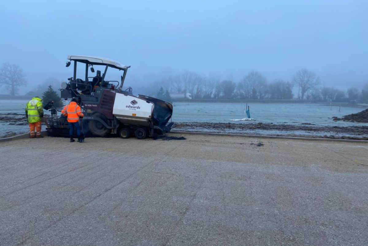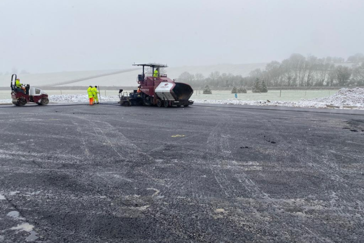 Following accurate installation of the sub base, we laid the binder course layer of asphalt macadam. Here we machine laid an AC20 DBM (20mm Asphalt Concrete Dense Binder Material), a standard binder course for almost all applications. Again, ensuring this layer is accurate means that we can lay the final surface course to specification. Inaccuracies up to this point can mean extra, more expensive surface course materials would be used to regulate an uneven binder course. Finally the surface course of 10mm SMA (Stone Mastic Asphalt) was machine laid to the car park and the access track.